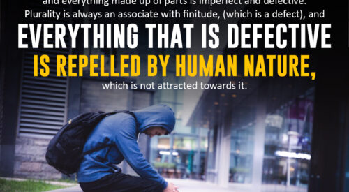 “The pole of attraction of human nature should be one and unique, because everything capable of plurality and everything made up of parts is imperfect and defective. Plurality is always an associate with finitude, (which is a defect), and everything that is defective is repelled by human nature, which is not attracted towards it.” SOURCE:…